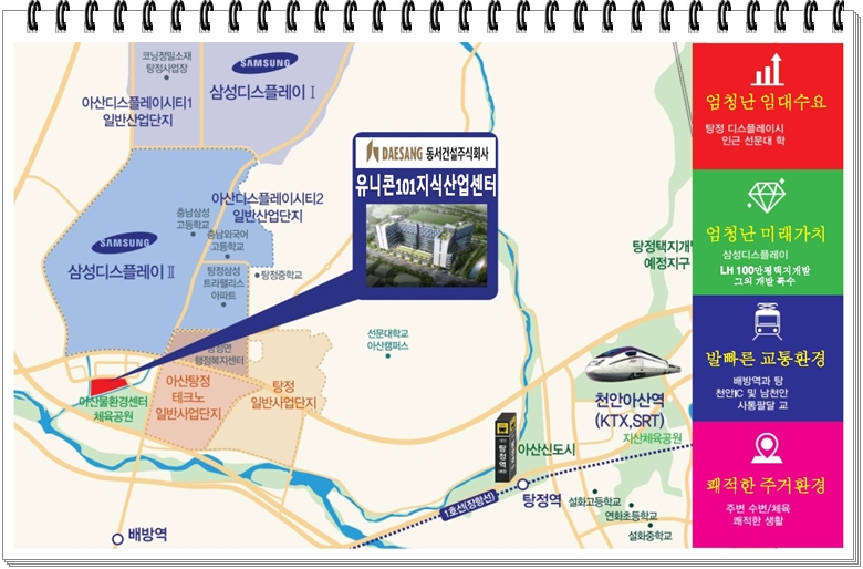 ‘유니콘101’은 삼면이 녹지로 둘러 쌓여 있는데다가 바로 앞에 하천이 흐르고 있고 길 건너에 체육공원을 끼고 있어 환경이 쾌적할 뿐만 아니라, 삼성디스플레이시티 정문 바로 앞 약 200m 거리에 위치한 입지로도 투자자들의 주목을 받고 있습니다.