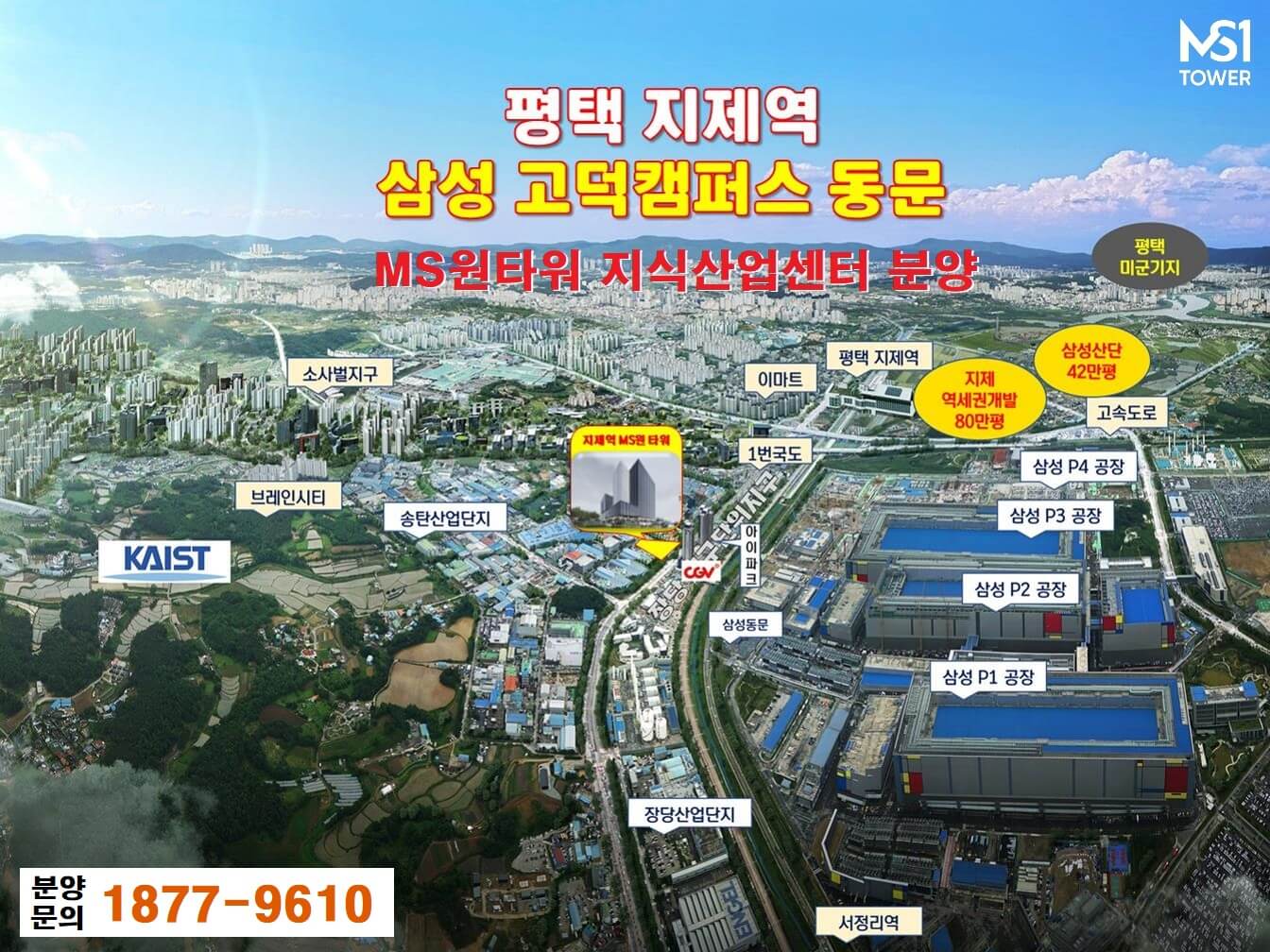 평택 삼성 반도체 3기 공장 2022년 말 준공! 삼성 협력 사용 지식산업센터 삼성 P3, P4 최대 수혜 입지인 '평택 지제역 ms 원 타워 (엠에스원타워)’는 삼성 평택 캠퍼스 및 브레인시티 중심에 위치해 있어 연관 산업체들을 중심으로 한 수요 확보에 무척 유리합니다. 이외에도 LG전자 디지털파크, 진위산업단지 등약 20여 개의 산업단지가 평택 내 집적돼 있어 잠재수요가 많습니다.
