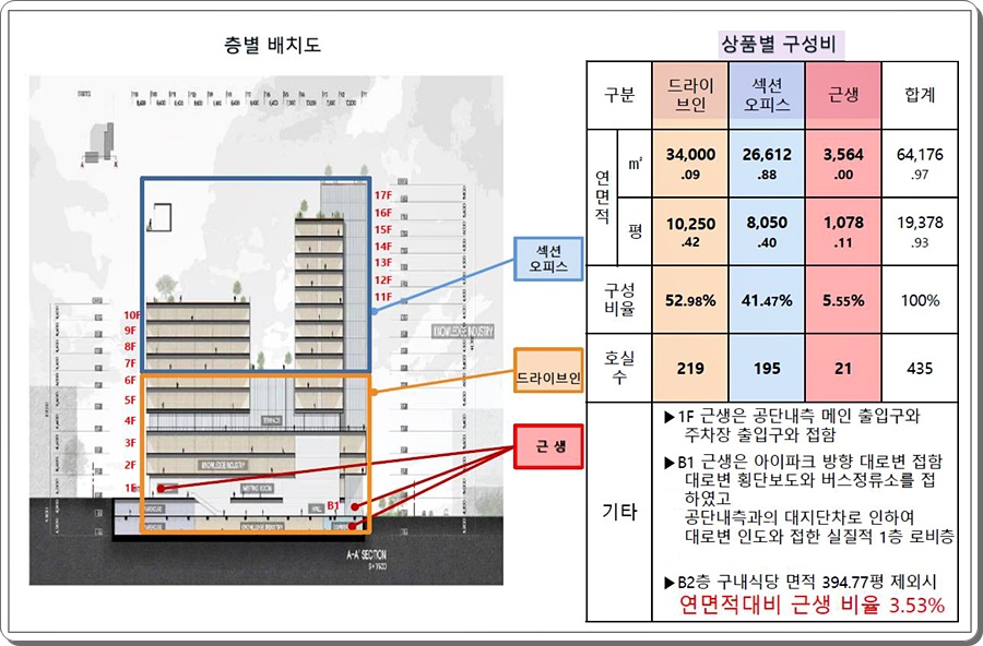 지하 2층~지상 17층 연면적 6만 4176㎡ 규모로 조성됩니다. 지식산업센터와(제조형 +섹션 오피스) 지원시설(근린생활시설)이 동시 분양되며 입주전까지 들어가는 금액은 계약금 10% 입니다.