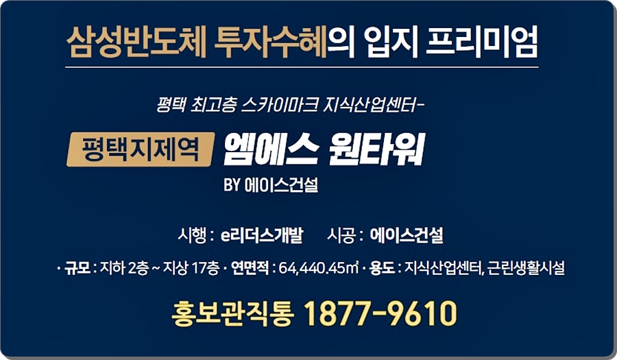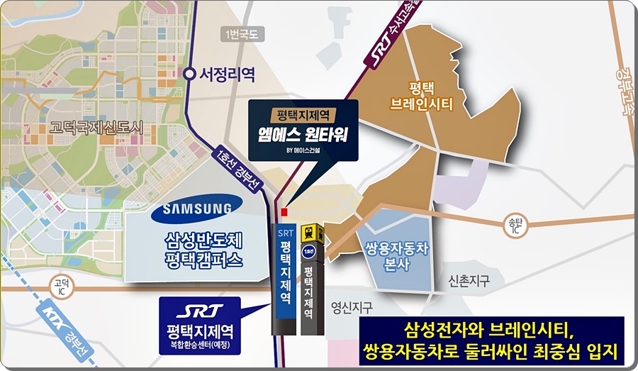 평택 삼성반도체 3기 공장이 2022년 말에 준공을 앞두고 있는 이때에 (주)에이스건설이 시공하는 ‘평택 지제역 ms원 타워 (엠에스원타워)' 는 경기도 평택시 모곡동 447-3번지에 위치합니다.