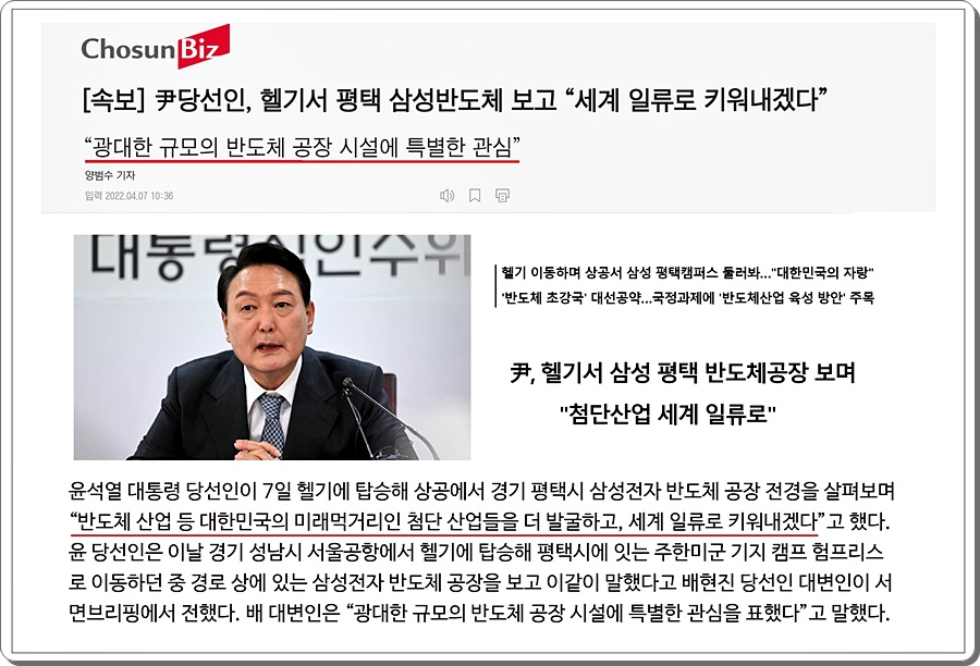 얼마전 윤석열 당선인이 평택 삼성반도체를 둘러보고 반도체 공장 시설에 특별한 관심을 가져 세계 일류로 키워내겠다고 말했습니다. 첨단산업 세계 일류로 반도체산업 육성 방안 반도체 초강국으로 만들겠다고 했습니다.