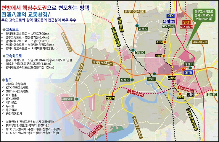 차량으로는 평택동부 고속화도로가 2024년 말에 완공을 앞두고 있기 때문에 용서 고속도로와 연결이 되면서 서울까지 빠르게 오고 갈 수 있는데요. 그렇기 때문에 직장이 평택이 아닌 서울에 있으신 분들 또한 자유롭게 출퇴근을 하실 수 있다는 장점이 있습니다.