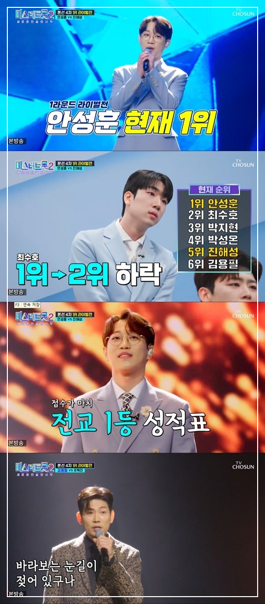 장윤정은 "안성훈씨 노래 들으면서 '잘한다. 참 잘한다. 징그럽게 잘한다. 안성훈 왜 저래.' 이렇게 적어놨다"며 "사람이 때가 있지 않냐. 지금의 안성훈의 때인 것 같다"며 극찬했습니다. 안성훈이 1278점을 받으며 그간 1위에 있던 최수호를 제치고 1위로 올라섰다. 두 사람 중 안성훈이 승리했습니다.