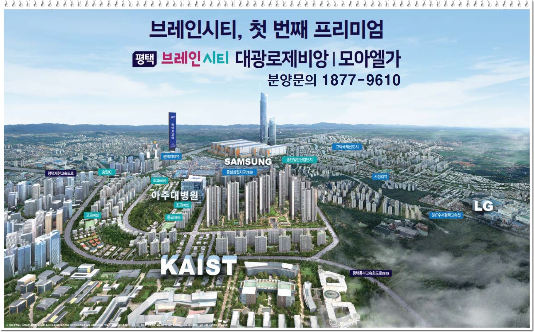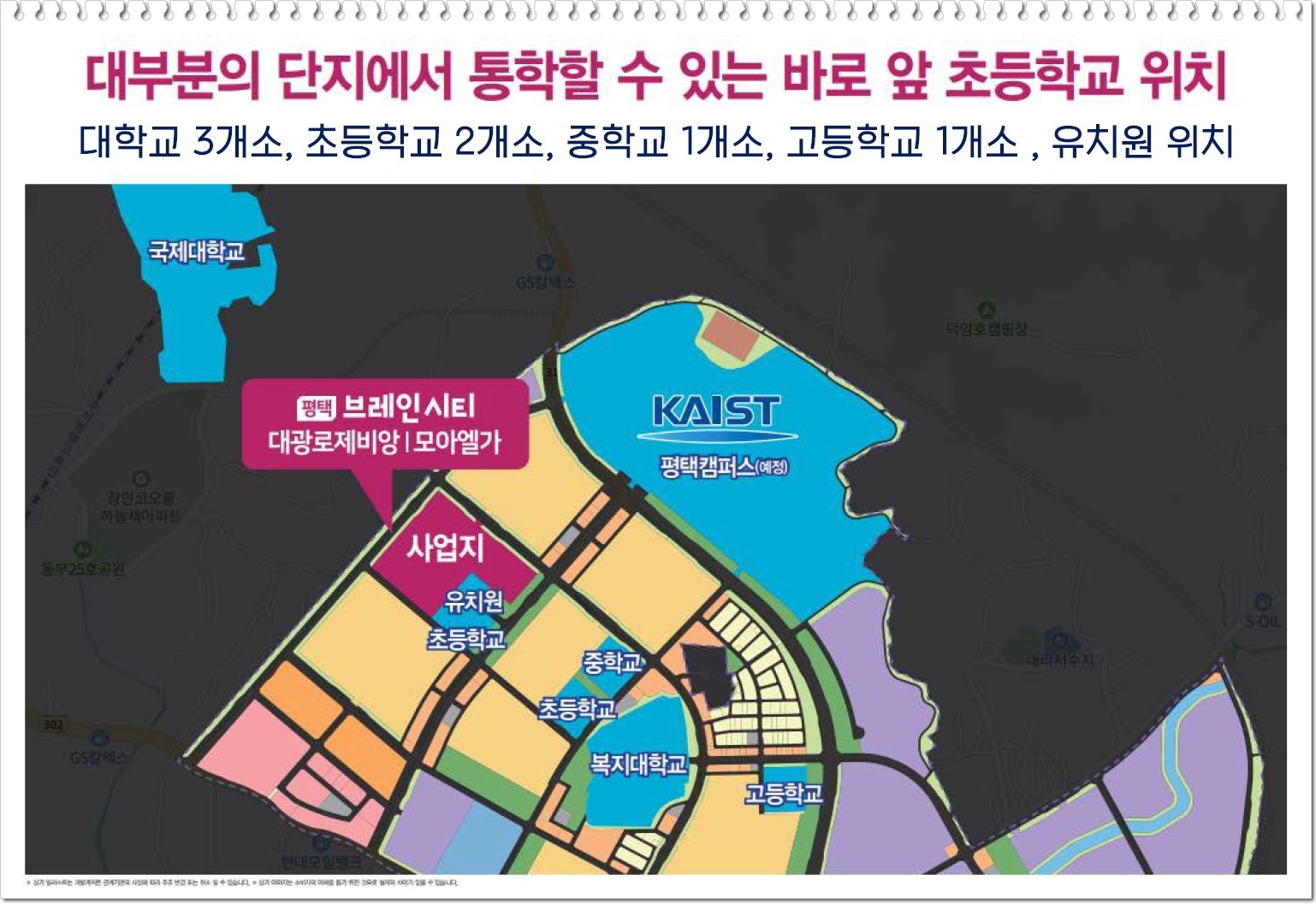 좀더 구체적으로 보면 브레인시티 내 약 46만㎡ 부지에 카이스트 평택캠퍼스가 2025년 개교 예정이며, 아주대학교 의료원이 평택 브레인시티PFV와 토지매매계약을 체결, 500병상 규모의 아주대학교 평택병원을 건립할 예정으로 무척 기대치가 높은 지역입니다.