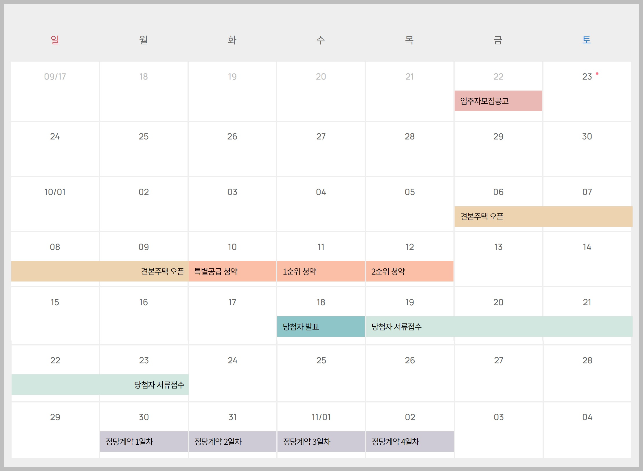 청약 일정은 오는 10일(화) 특별공급을 시작으로 11일(수) 1순위, 12일(목) 2순위 청약을 받습니다. 이후 18일(수) 당첨자를 발표하고 10월 30일(월)부터 11월 2일(목)까지 4일간 정당계약을 실시합니다.