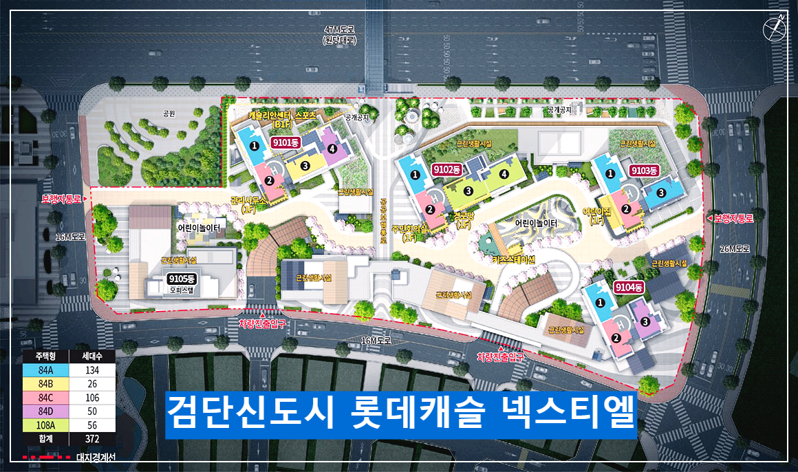 검단신도시 첫 롯데캐슬 아파트는 '검단신도시 롯데캐슬 넥스티엘'로 검단신도시 최중심 입지인 인천지하철 1호선 연장 신설역(가칭 101역/2025년 예정) 역세권 RC1블록에 지하 2층~지상 최고 29층, 4개동, 전용면적 84㎡·108㎡, 총 372가구 규모로 조성됩니다.
