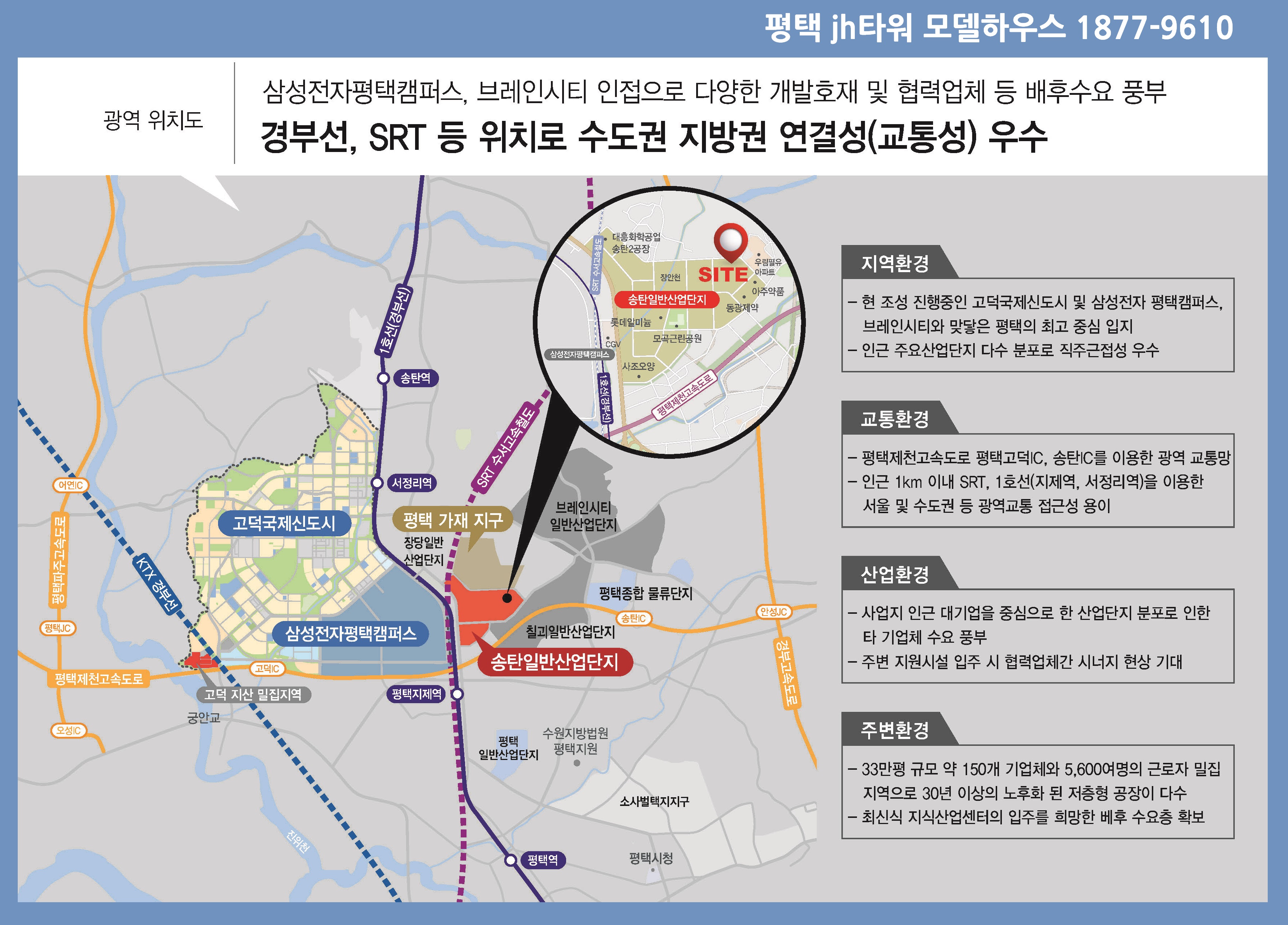현장 바로 왼쪽에는 세계적인 글로벌 삼성전자 평택캠퍼스가 있고 또한 고덕국제 신도시가 있습니다. 바로 오른쪽에는 평택 종합 물류단지, 칠괴일반산업단지, 평택 브레인시티가 있어 최.고의 입지를 자랑하는 곳입니다.