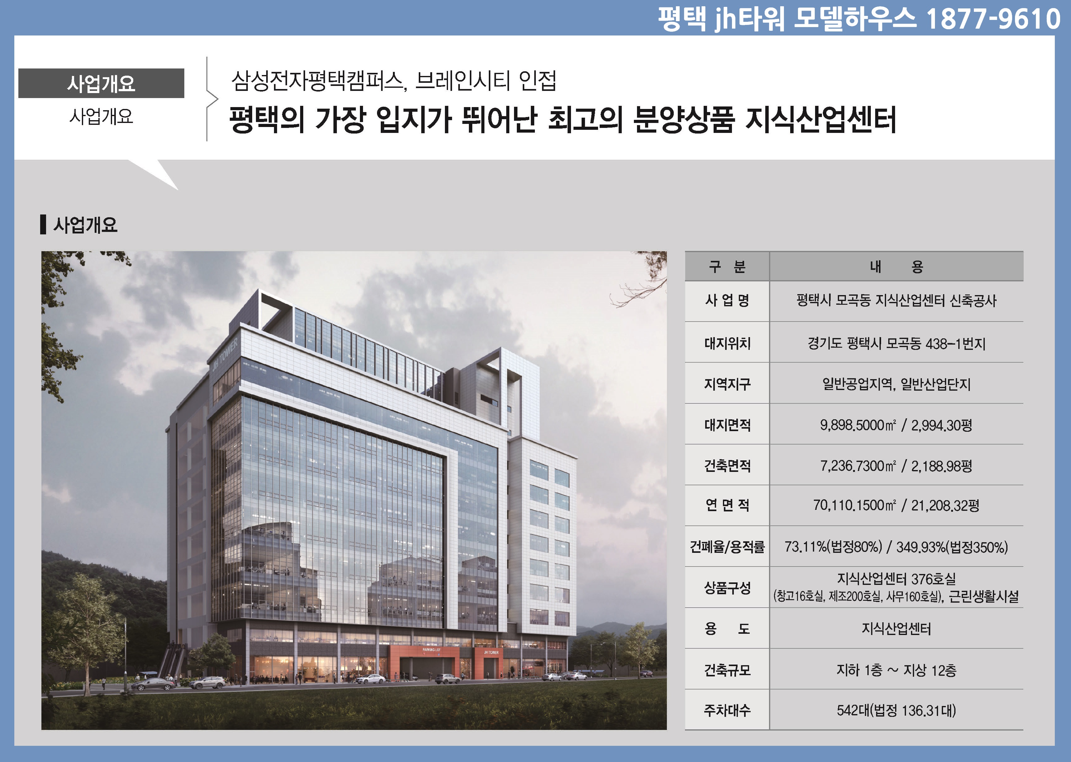 평택시 지식산업센터 제조형 드라이브와 오피스 사무동을 갖춘 JH지식산업센터는 모곡동 438-1번지 일원에 들어섭니다. 평택브레인시티 수혜지역입니다.