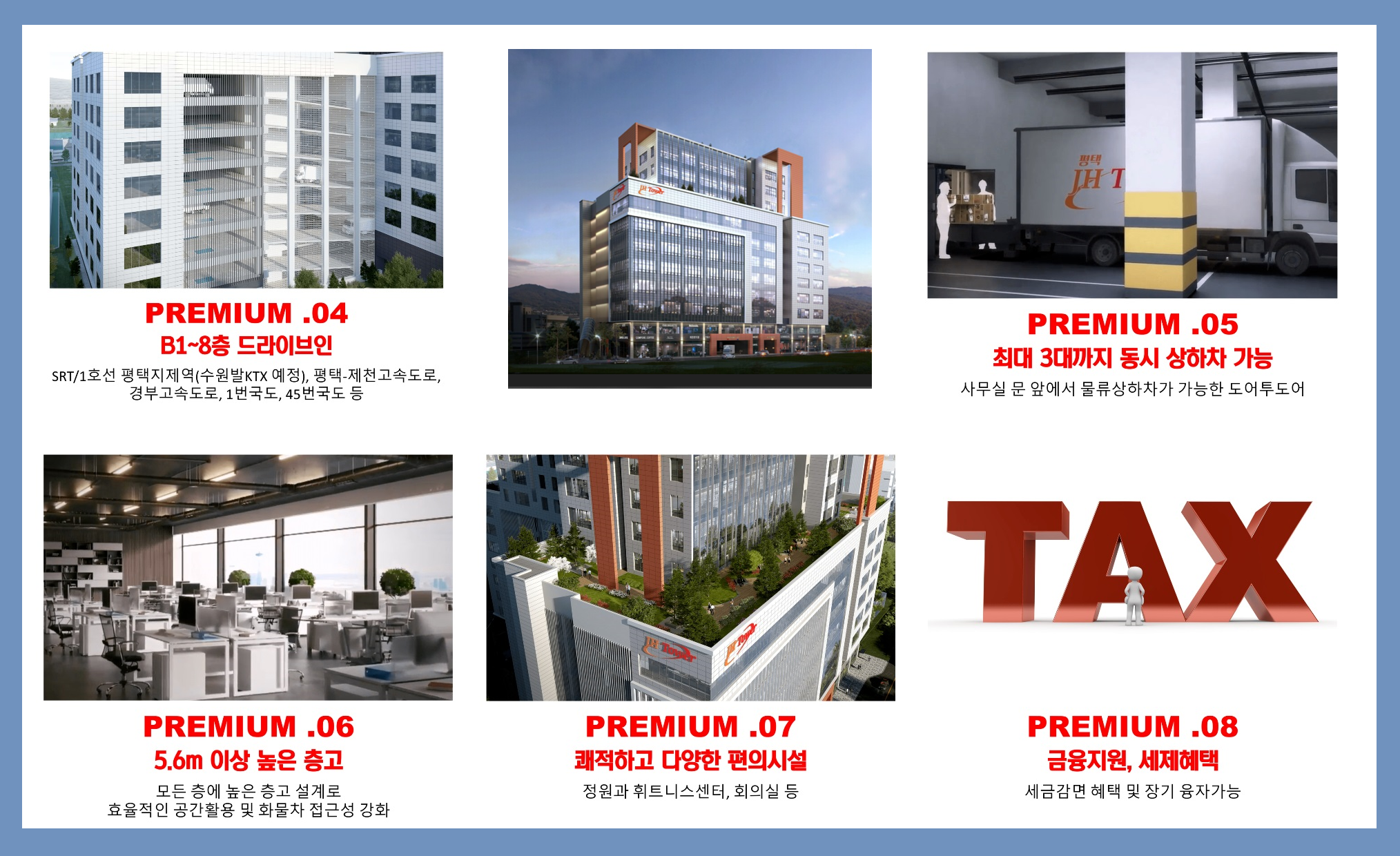 평택시 JH타워는 제조형 호실에 입주하는 입주사들을 위해 드라이브인 시스템을 적용했습니다. 드라이브인 시스템을 적용 하는 뿐만 아니라 차량운행 동선이 어긋나지 않는 직선형 램프와 7.8M의 광폭로를 자랑합니다;