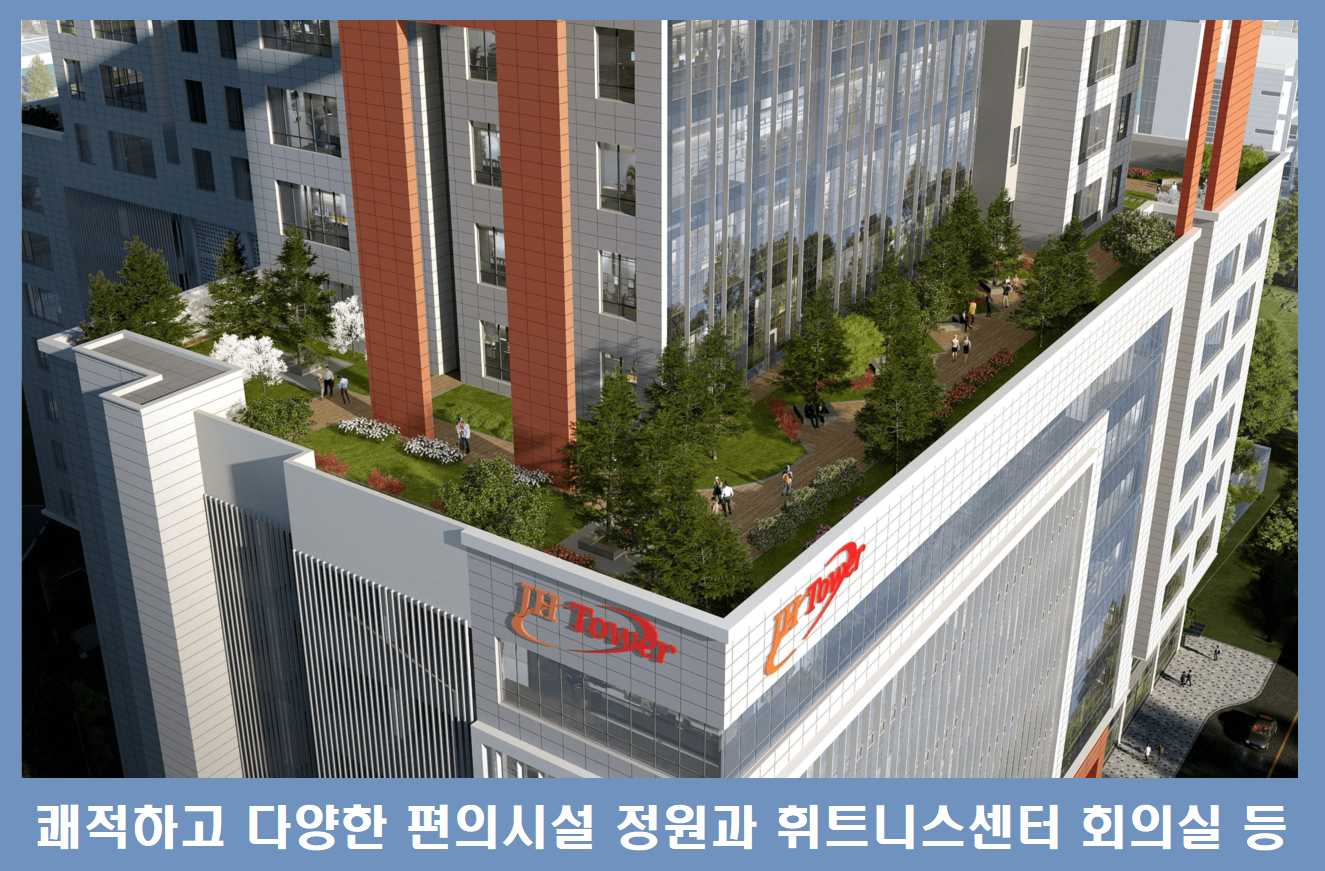 평택 JH타워 지식산업센터는 다양한 휴게공간을 제공해 더욱 이목이 집중되고 있습니다. 9층 옥상정원과 스카이가든을 비롯해 피트니스센터, 회의실 등 운동시설과 편의시설을 갖춰 비즈니스 차원을 높여주고 업무의 효율성을 극대화할 수 있는 서비스를 제공할 예정입니다.