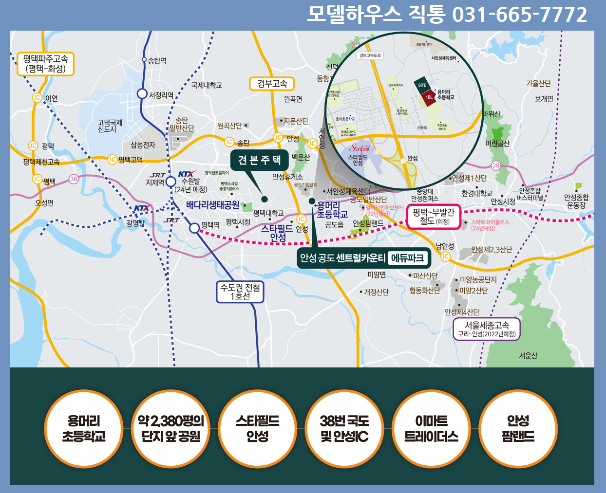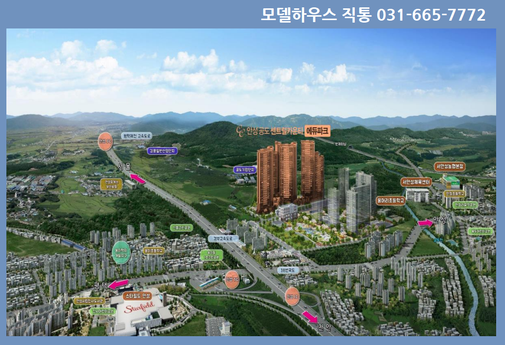 공동버스터미널과 경부선 평택역을 비롯해 대중교통을 이용하기편하고, 자차를 이용하신다면 38번국도로를 통해 원도심과 평택생활권으로 원활한 이동이 가능합니다. 뿐만 아니라 인근에는안성IC가 위치해 있어 전국의 광역 교통망과 연결되어 교통입지로서의 강점을 보유하고 있습니다.