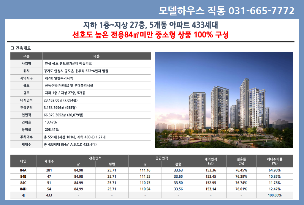 2024년 7월 입주 예정을 두고 있는 용두리 522-4번지 일원의 7,094평 대지에 433세대 규모로 신축되는 안성 공도 센트럴카운티 에듀파크는 현재 다양한 평형과 혜택을 제공하며 분양 중입니다.