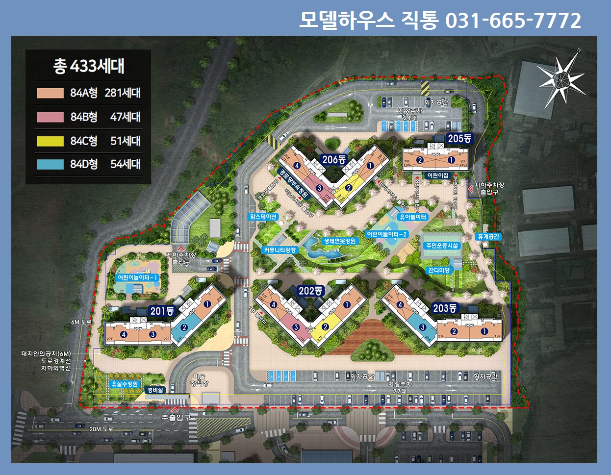 단일 평형 84㎡에 A타입 281세대, B타입 47세대, C타입 51세대, D타입 54세대로 구성되어 있으며, 이 아파트 단지는 지하 1층부터 지상 27층까지 총 5개 동으로 이루어져 총 433세대가 입주할 예정입니다.