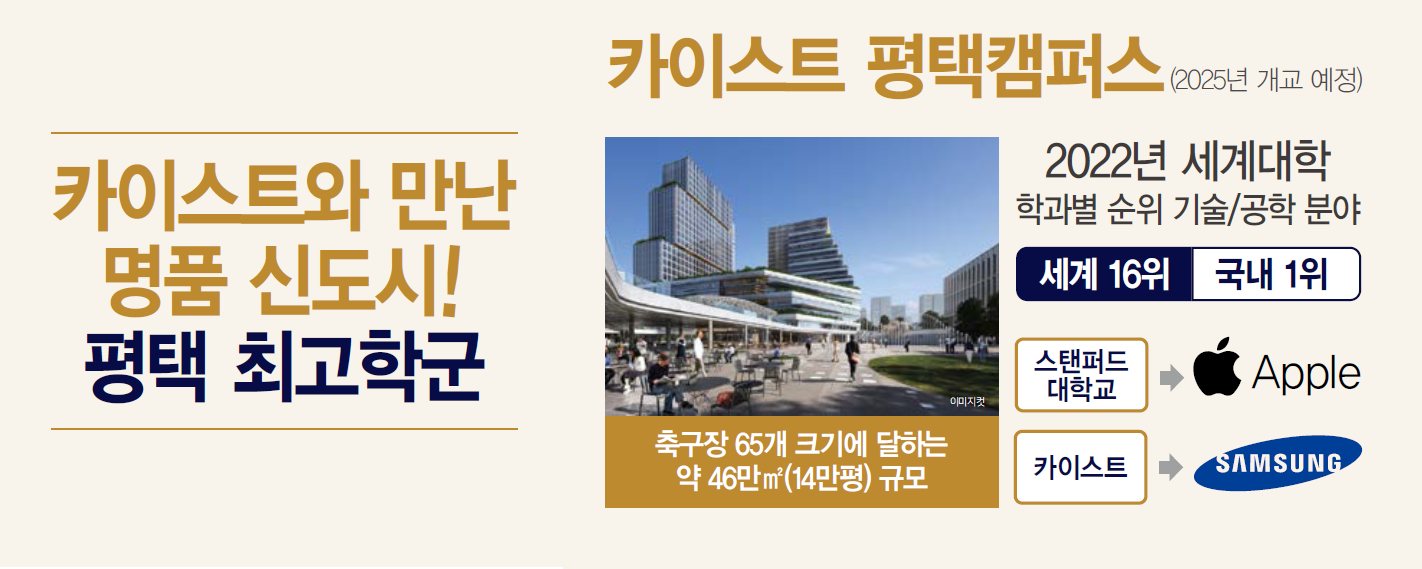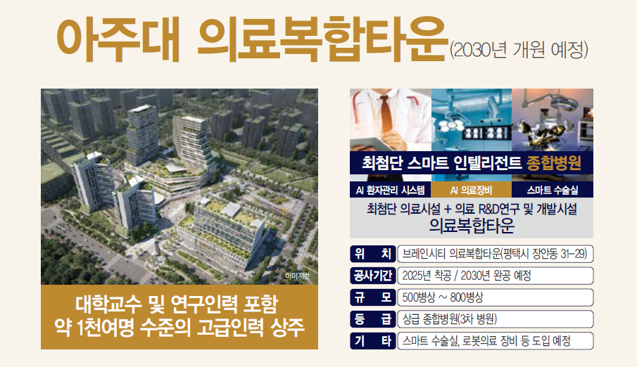 또한 평택 브레인시티에는 카이스트 평택캠퍼스가 오는 2025년 건립될 예정에 있으며, 아주대학교 평택병원도 2030년 조성될 예정입니다.