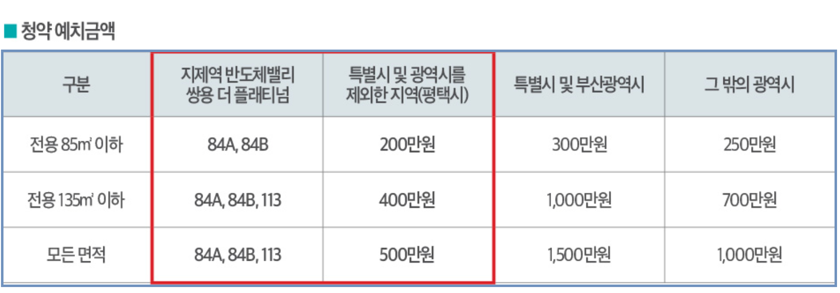 84m²타입 청약시 예치금은 평택시 200만원 서울,부산 300만원 그밖의 광역시 250만원