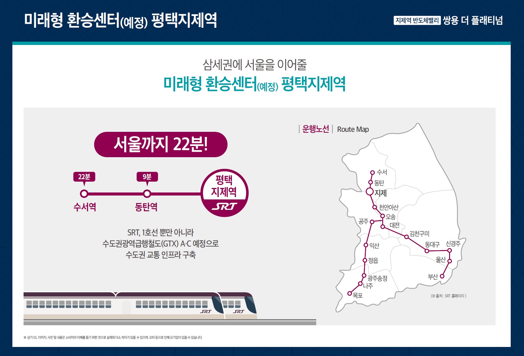 서울까지 22분, SRT, 1호선 뿐만 아니라 수도권 광역급행철도(GTX)A,C 노선 예정으로 수도권 교통 인프라를 구축 할것입니다.