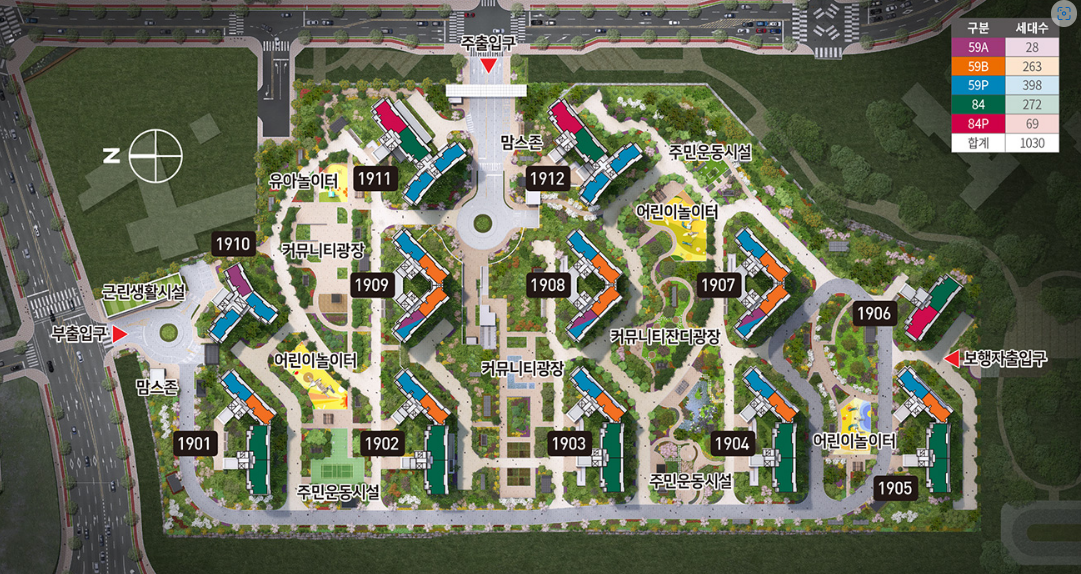 단지 지상은 차가 다니지 않도록 설계해 입주민의 안전하고 쾌적한 생활이 가능합니다. 곳곳에는 수공간을 비롯해 정원, 놀이시설 및 휴게공간 등 다양한 조경시설이 배치됩니다.