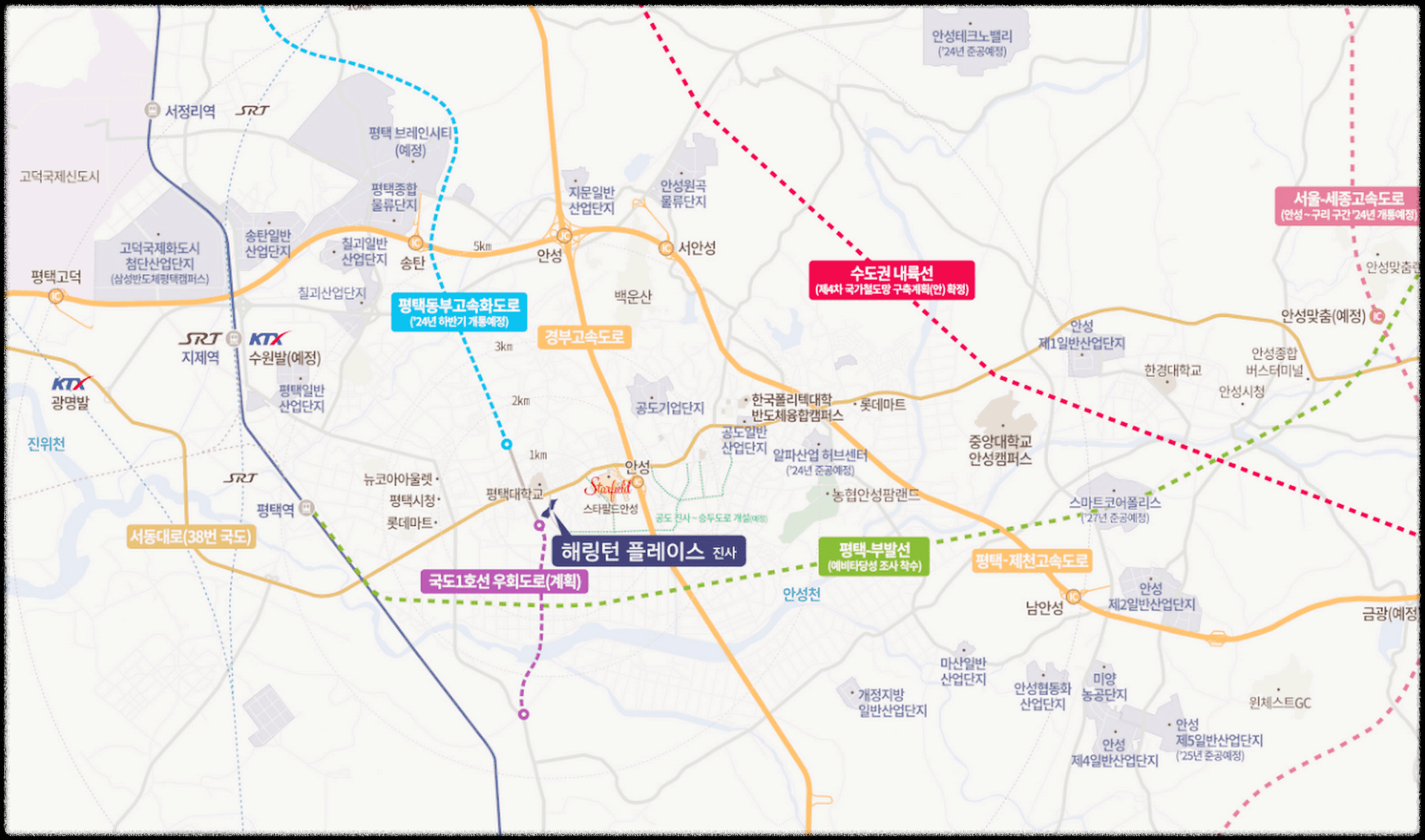 교통부분에서는 아파트 단지 앞에는 안성과 평택을 관통하는 서동대로(38번 국도)가 위치하고,경부고속도로 안성IC와 광역버스 정류장 등 광역 교통망도 잘 갖춰져 있습니다.