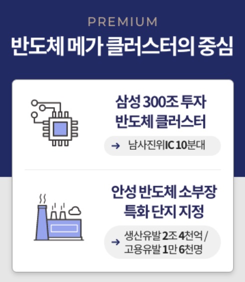 안성은 최근 정부가 선정한 국가첨단전략산업 특화단지 7곳 중 국내 반도체산업의 기술자립화, 공급망 내제화를 위한 소부장(소재부품장비) 특화단지로 지정되면서 용인~평택을 잇는 세계 최대 규모의 반도체 클러스터를 완성하는 요지로 주목받고 있습니다.