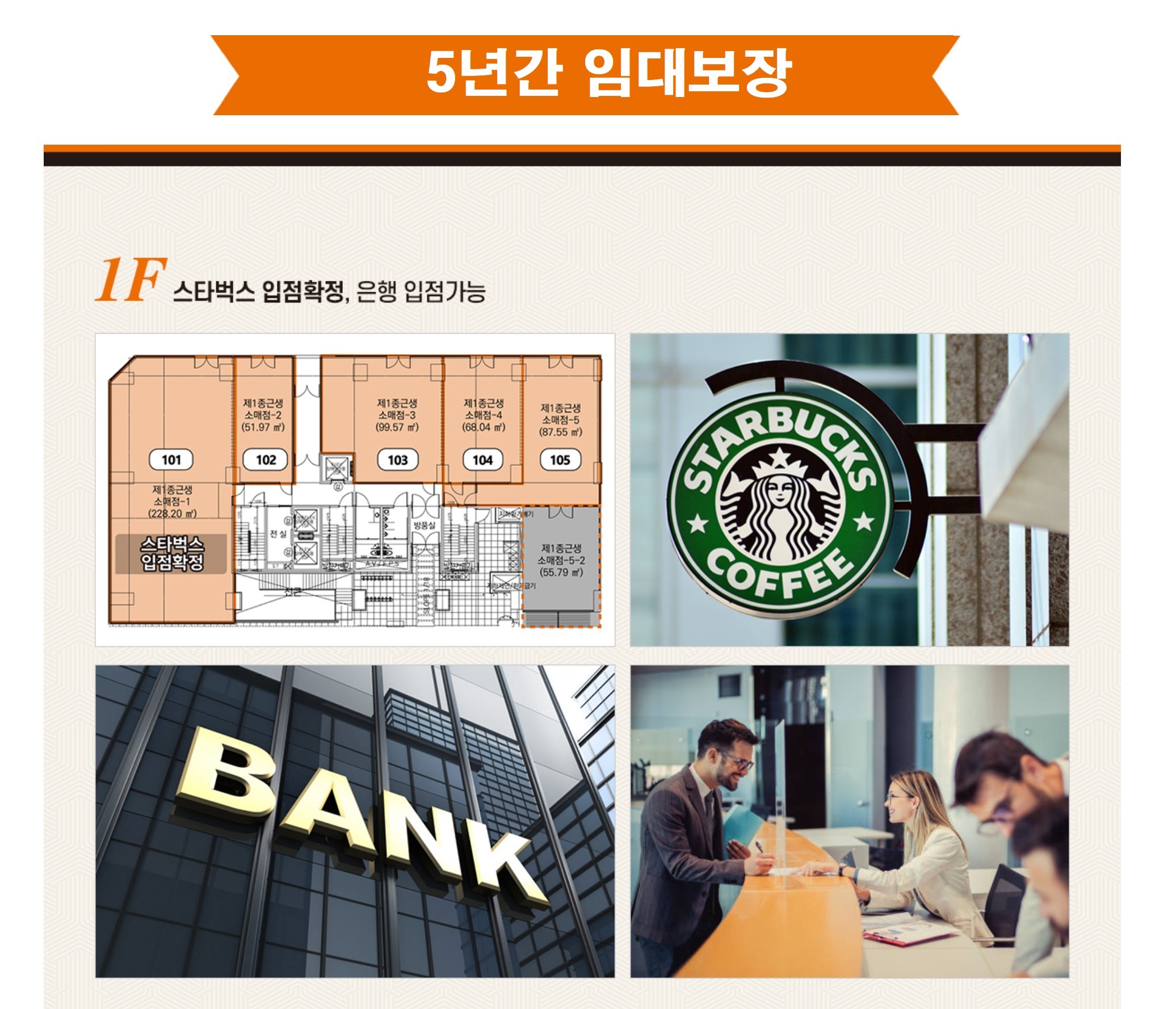 1층에는 주로 스타벅스를 비롯해 편의시설 및 음식점, 약국, 은행 등 생활밀착형 업종이 들어설 예정이며, 2층은 비교적 넓은 평형으로 구성돼 병원이나 학원 업종이 임대하기에 적합합니다.