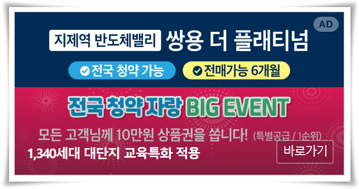 쌍용건설은 이달 중 삼성전자 평택캠퍼스 바로 옆 지제역 반도체밸리(가재지구 도시개발사업) 공동1블록에 들어서는 '지제역 반도체밸리 쌍용 더 플래티넘'을 분양할 예정입니다.