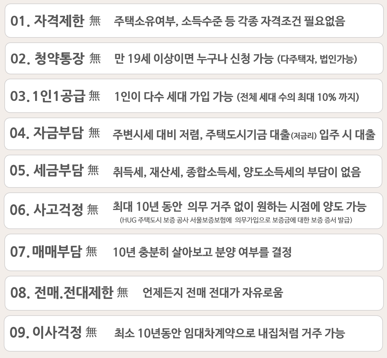 민간 임대는 10년 동안 내 집처럼 살다가 10년 이후 분양전환을하여 소유권을 받아도 되고 아니면 입주권 지위 양도를 통해 전매도 가능 하니 부담 없는 조건입니다. 분양전환시 주변시세와 상관없이 미리 정해놓은 확정분양가에 전환되기 때문에 내집마련에 있어 무척 수월하합니다.