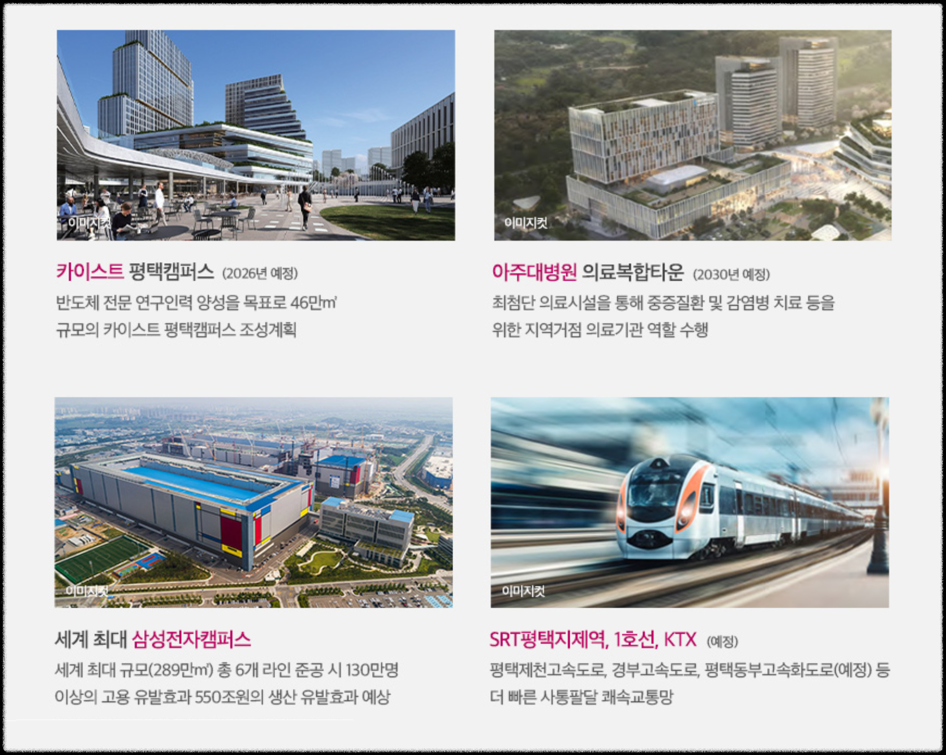 산업단지의 수혜도 기대됩니다. 우선 세계 최대 규모의 반도체 생산 시설 삼성전자 평택캠퍼스가 가까이에 있으며 삼성전자는 이곳에 반도체 라인을 총 6기까지 확대할 계획으로, 이를 통해 130만 명 이상의 고용 유발효과와 550조원 규모의 생산 유발효과가 예상됩니다.
