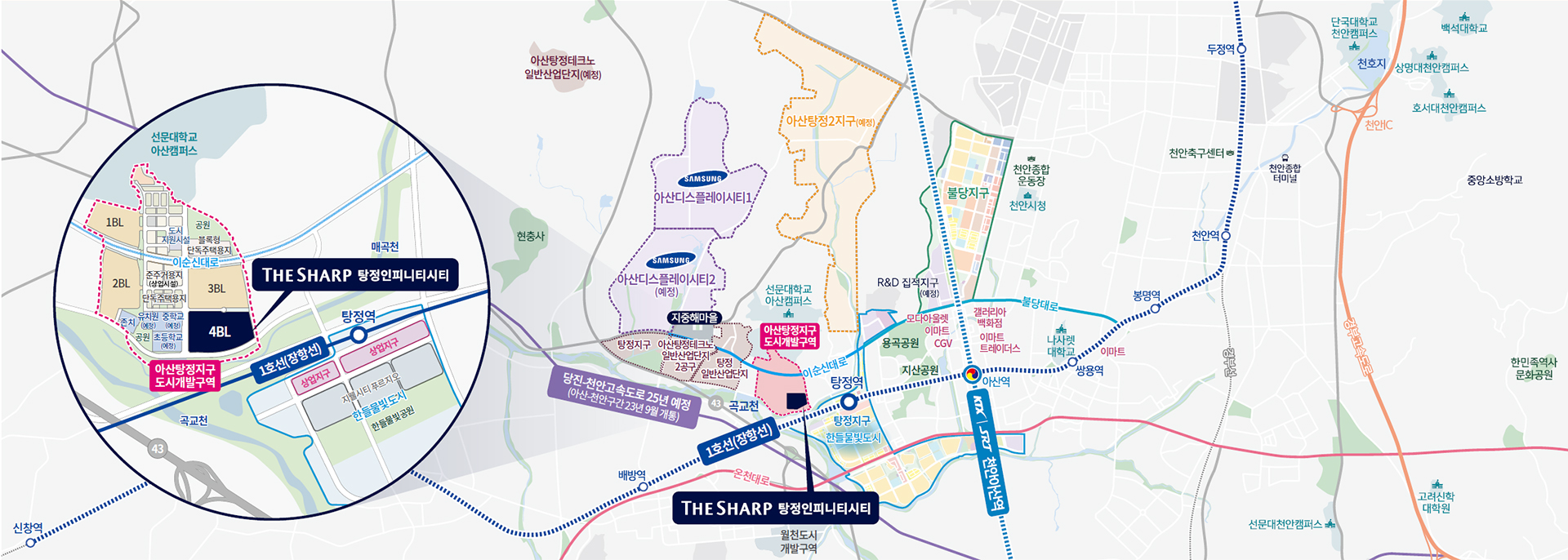 탕정지구 도시개발구역은 아산의 주거선호도가 가장 높은 탕정택지지구와 연결되며 생활권과 인프라를 공유하는 멀티 생활권을 형성해 지역가치를 더욱 높게 평가 받을 것으로 보여집니다.