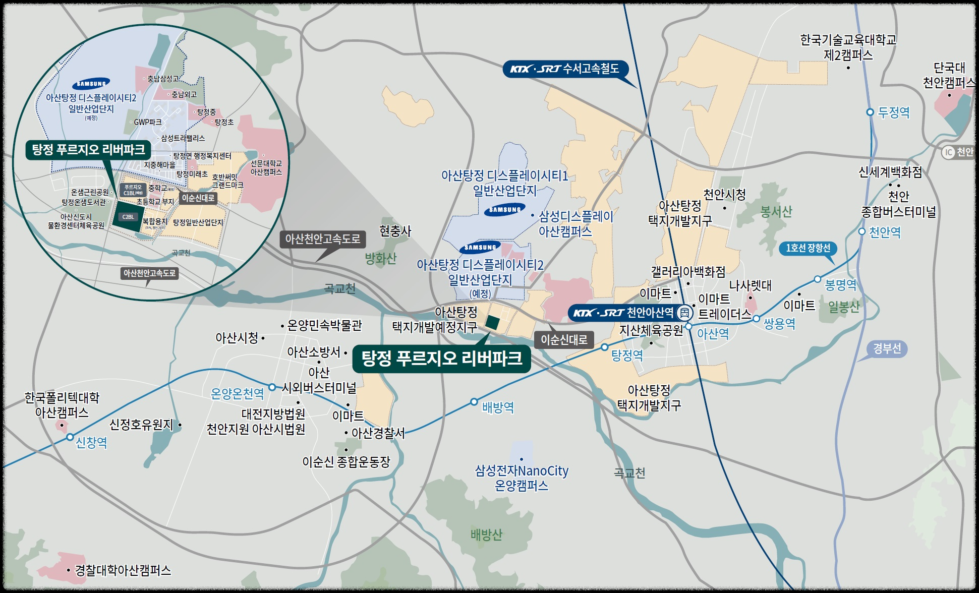 탕정 푸르지오 리버파크는 아산시청을 중심으로 한 아산 구도심과 천안시청을 중심으로 한 천안 구도심의 완성된 생활 인프라를 동시에 누릴 수 있습니다.