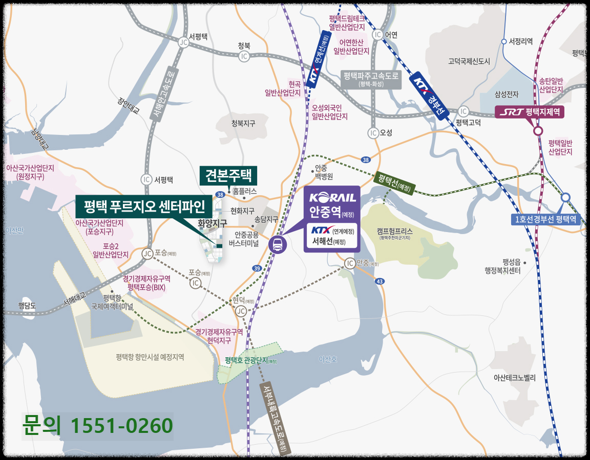 화성 향남 부근에서 경부고속선과 직결이 추진되고 있는 서해선복선전철 안중역이 올해 개통 예정으로 서울을 비롯해 경기남부와 충남 지역까지 접근성이 크게 개선 될 것으로 예상돼 향후 더 큰 미래가치까지 기대할 수 있습니다.