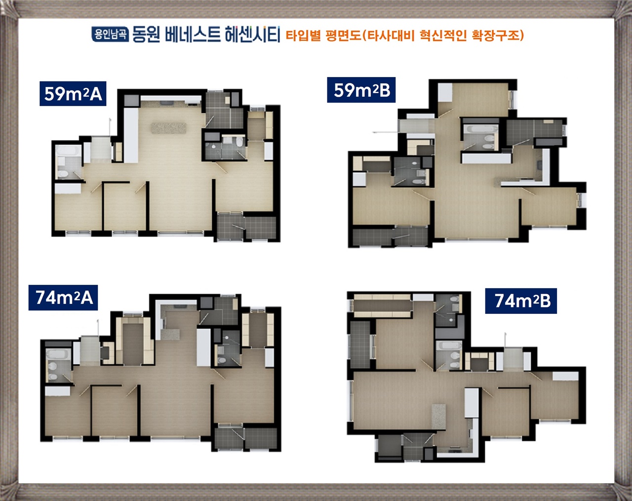 타입별 가구수는 59㎡A 274가구, 59㎡B 184가구, 74㎡A 112가구, 74㎡B 71가구 등 최근 꾸준히 늘어나고 있는 1~2인 가구부터 3인 가구까지 살기에 적합한 중·소형 평형 위주로 구성됩니다.