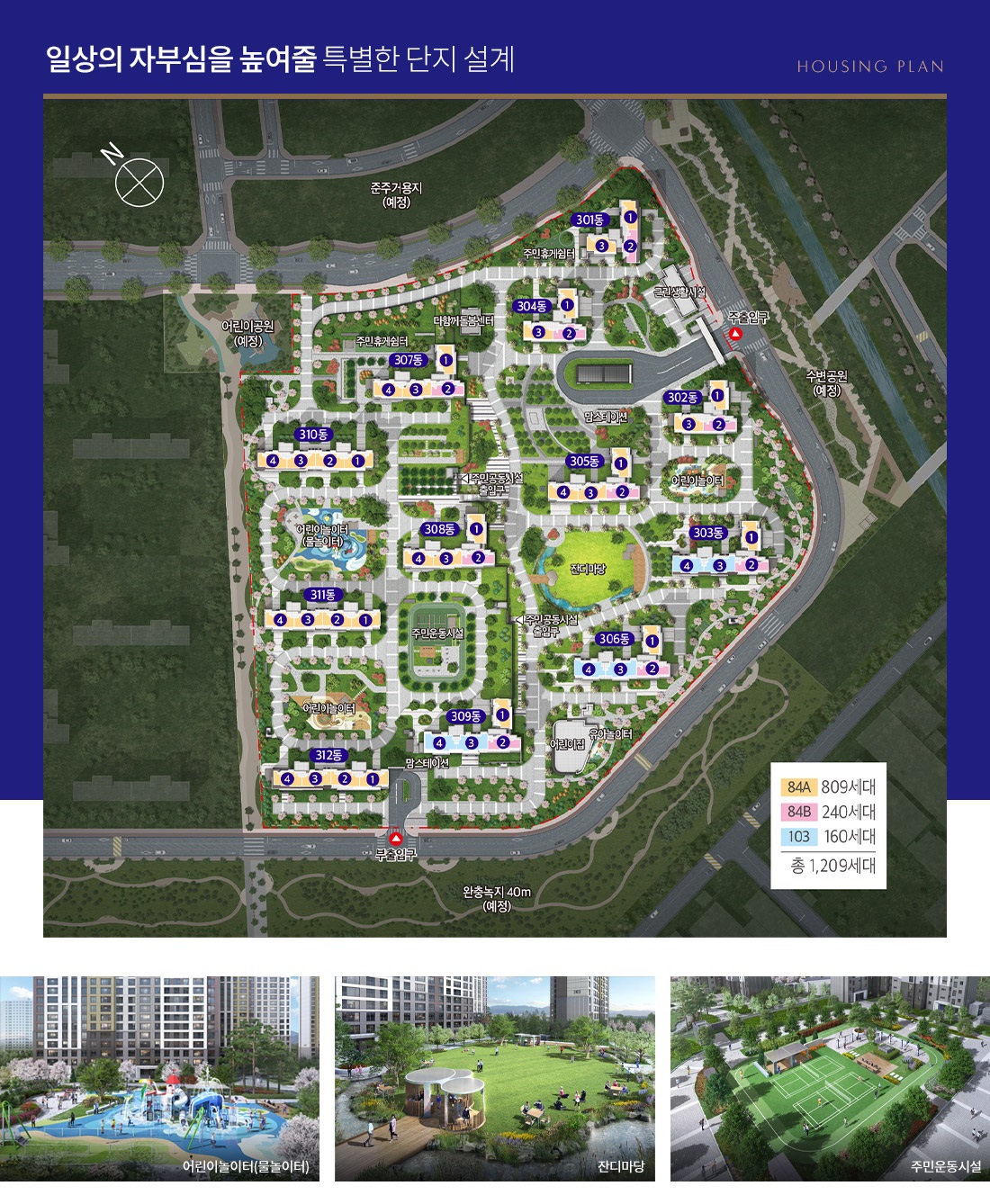 84㎡A형 809가구, 84㎡B형 240가구, 103㎡형 160가구 입니다.