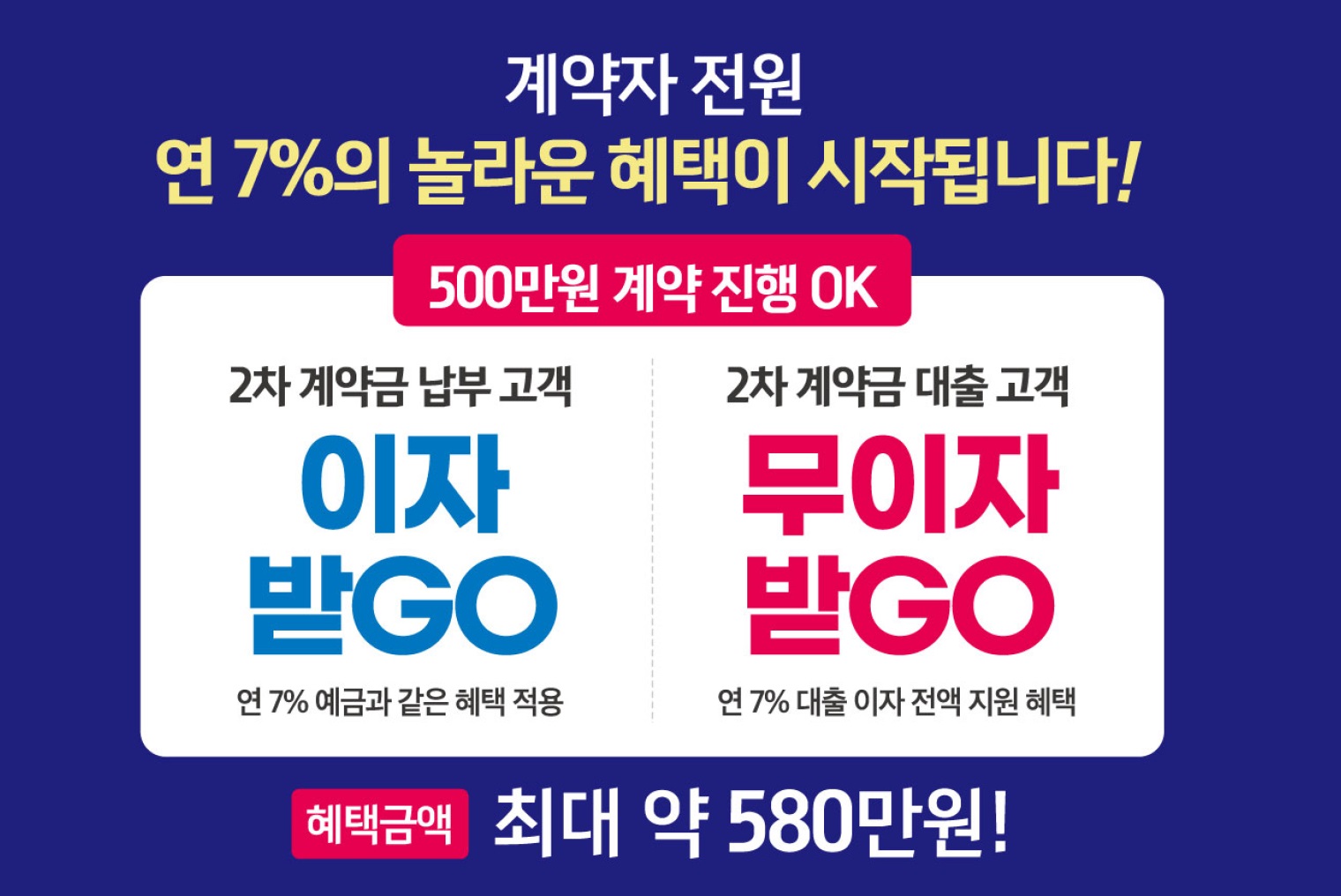 2차 계약금의 경우는 자납 시 연 7%의 예금 금리와 같은 이자금액을 계약자에게 전달하며 사업주체가 지정한 금융기관에서 신용대출로 납부 시 이자 전액을 지원합니다.