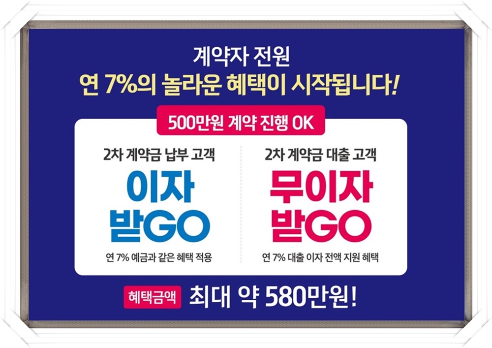 2차 계약금은 자납 시 연 7%의 예금금리와 같은 이자금액을 계약자에게 전달하며 사업주체가 지정한 금융기관에서 신용대출로 납부 시 이자 전액을 지원합니다.