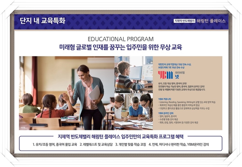 단지와 인접해 초등학교와 유치원이 단지 바로앞에 있으며, YBM과의 제휴로 입주민 자녀들은 YBM 원어민 강좌 2년 무상, 영어/일어/중국어 등 100여개 온라인 강좌 2년 무료 혜택이 주어집니다.