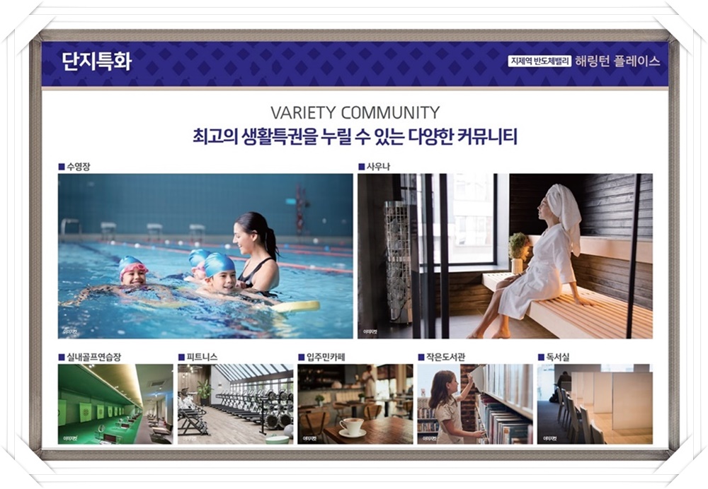 입주민을 위한 다양한 커뮤니티 시설이 갖춰지는 ‘지제역 반도체밸리 효성 해링턴 플레이스’는 단지 내에는 실내수영장이 들어서고, 골프연습장과 피트니스센터, 독서실, 작은도서관, 입주민 문화실, 맘스테이션 등이 들어섭니다. 또한, 단지 주변으로 장안천과 함께 수변공원이 조성 예정으로 주거환경이 쾌적합니다.