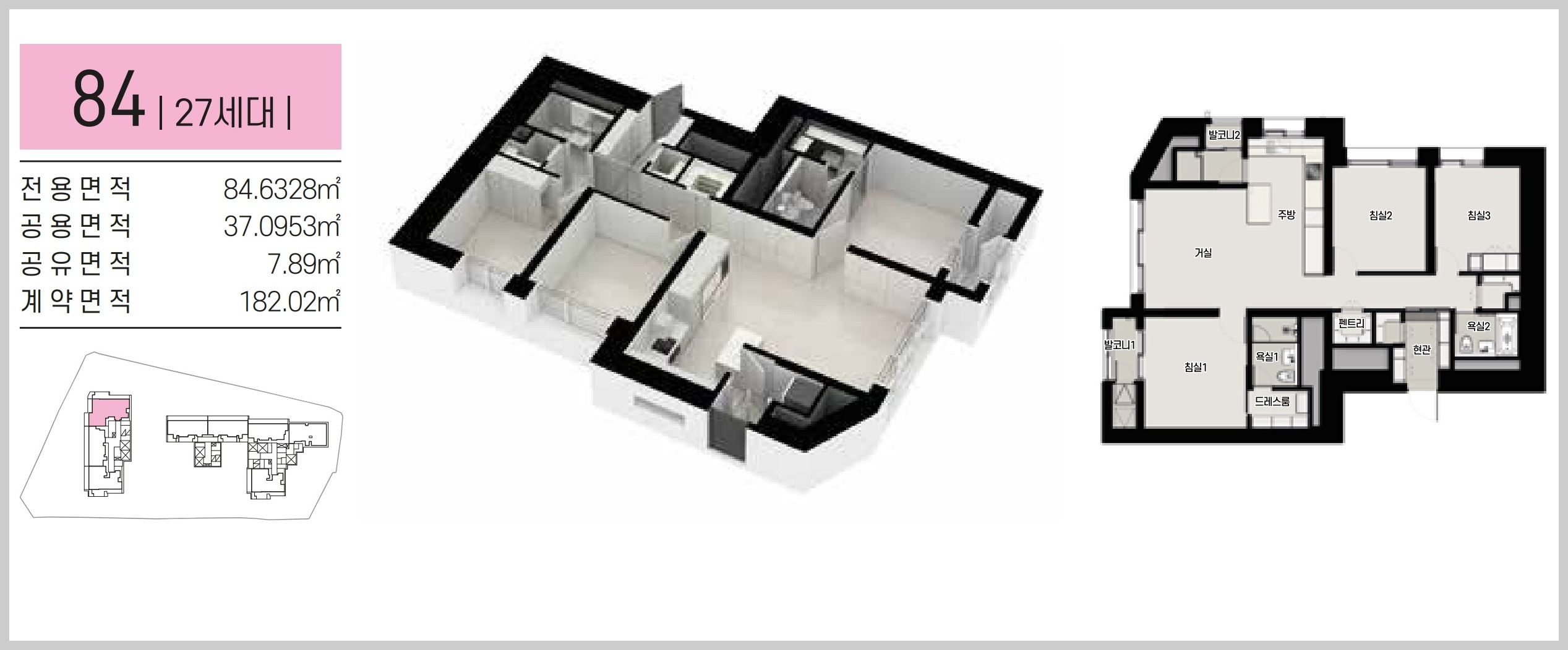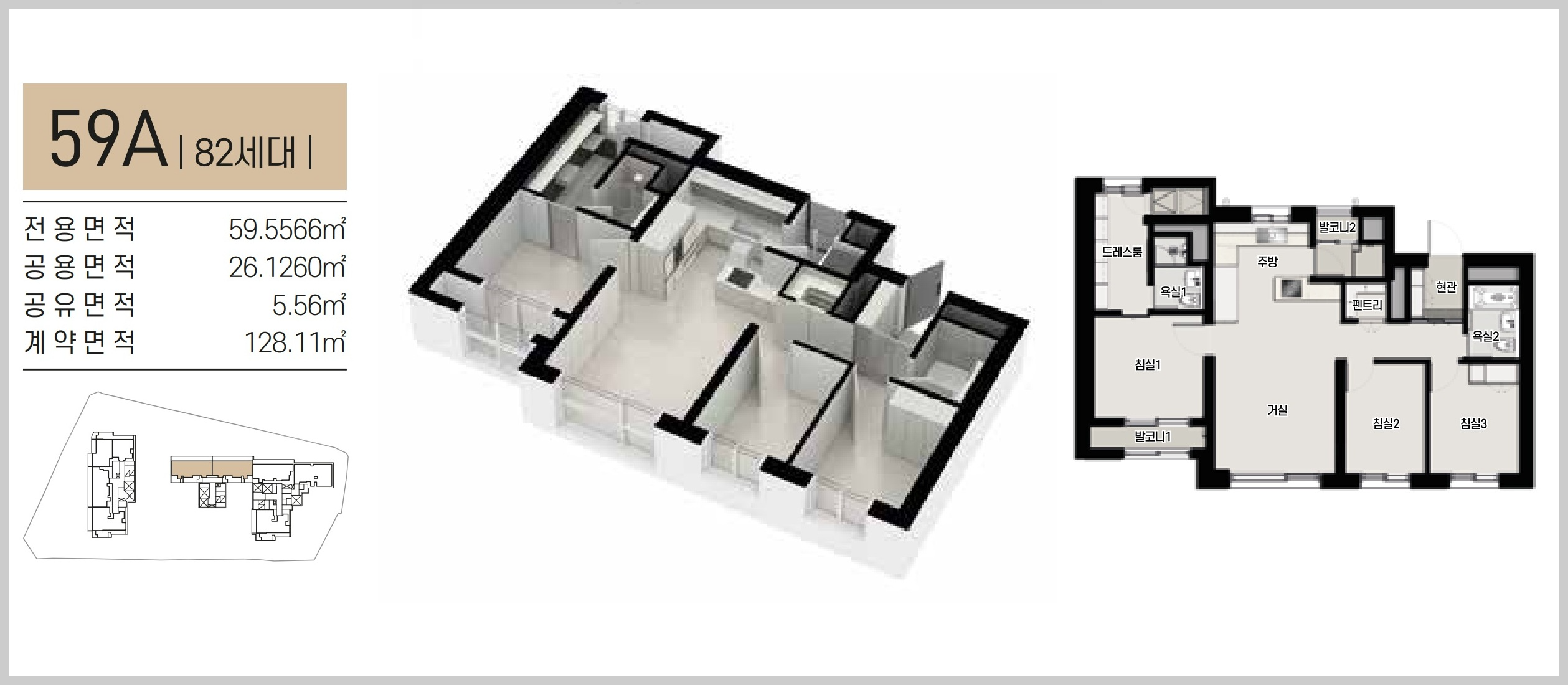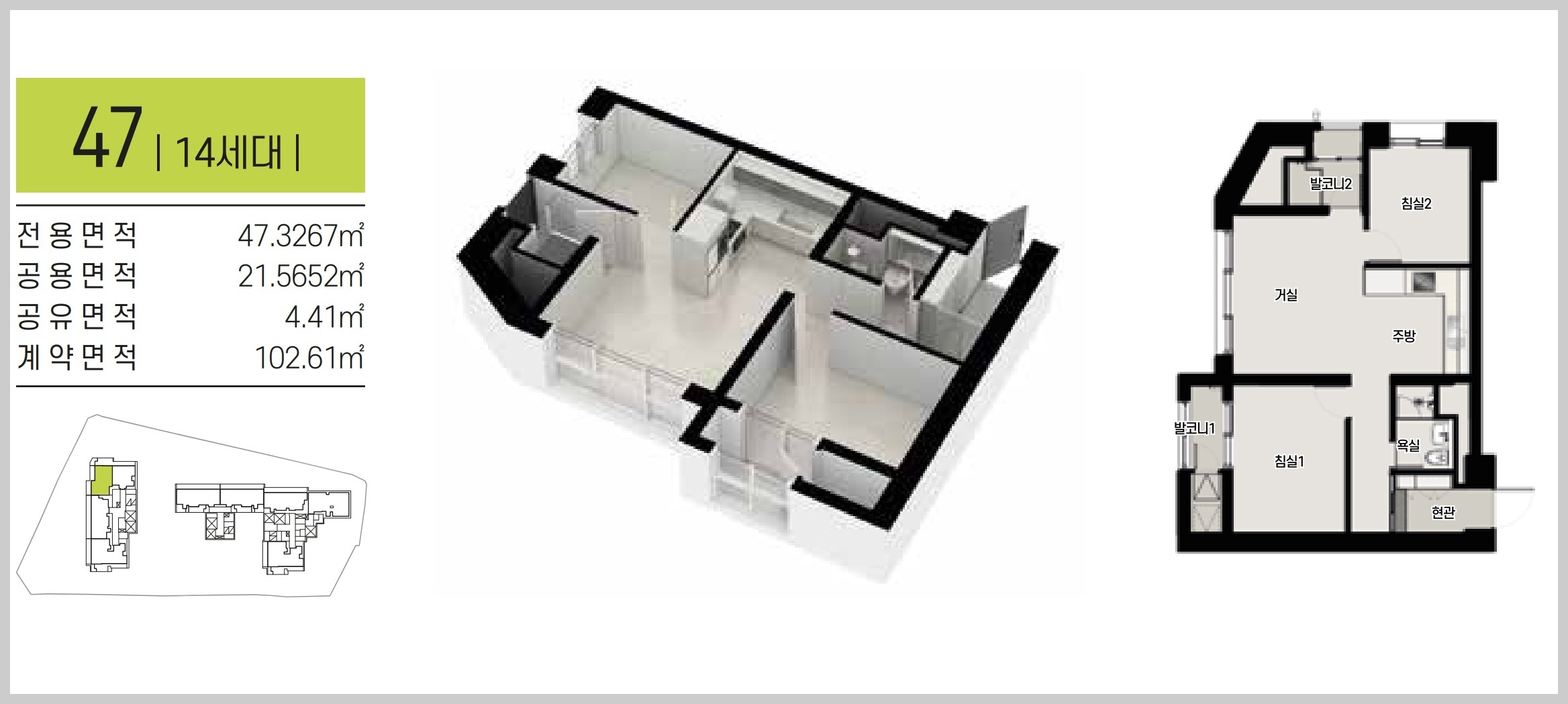 전용면적은 44, 47, 59, 84㎡ 등 중소형 실속 평형 위주이며, 생활가전이 풀옵션으로 제공됩니다.