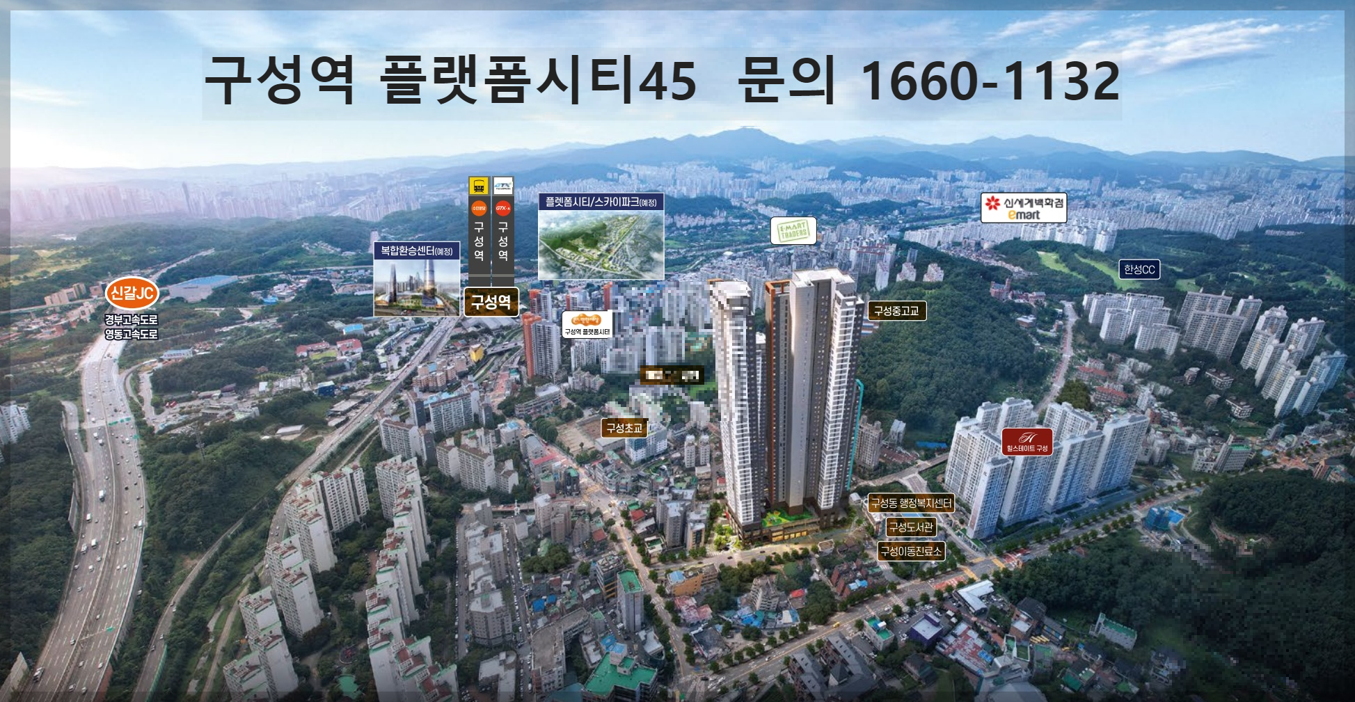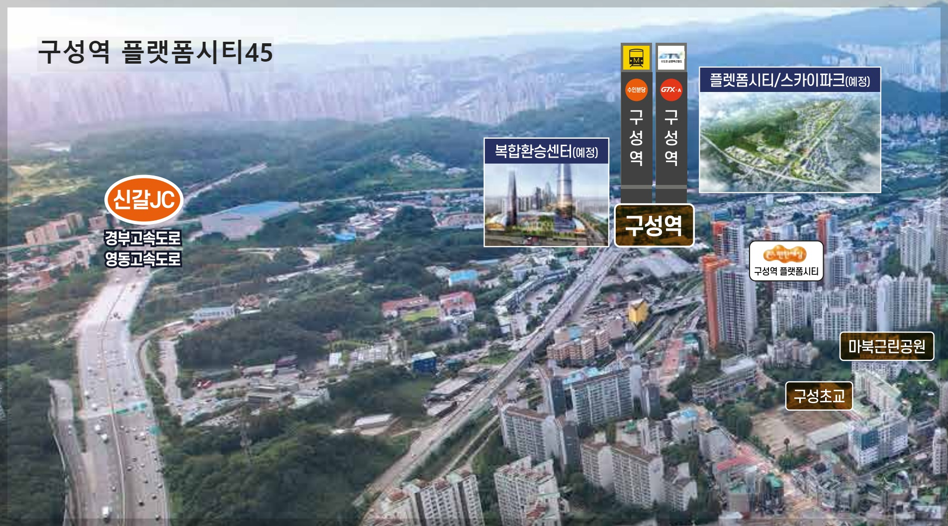 '구성역 플랫폼시티45'는 구성역이 있는 용인시 기흥구 언남동 일원에 지하 4층~지상 45층 규모 입니다.