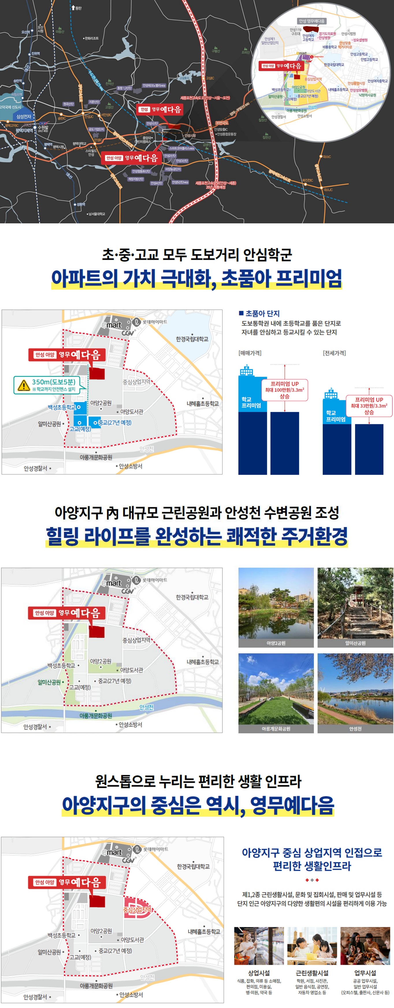 단지가 신도시급 중심생활권에 자리하고 있어 주변으로 다채로운 인프라도 갖춰져 있습니다. 백성초, 안성중(예정), 공립 아양도서관, 학원가 등 탄탄한 교육환경이 조성됐습니다. 이마트와 CGV, 경기도의료원 안성병원 등 중심상업시설도 도보로 쉽게 이용할 수 있습니다.