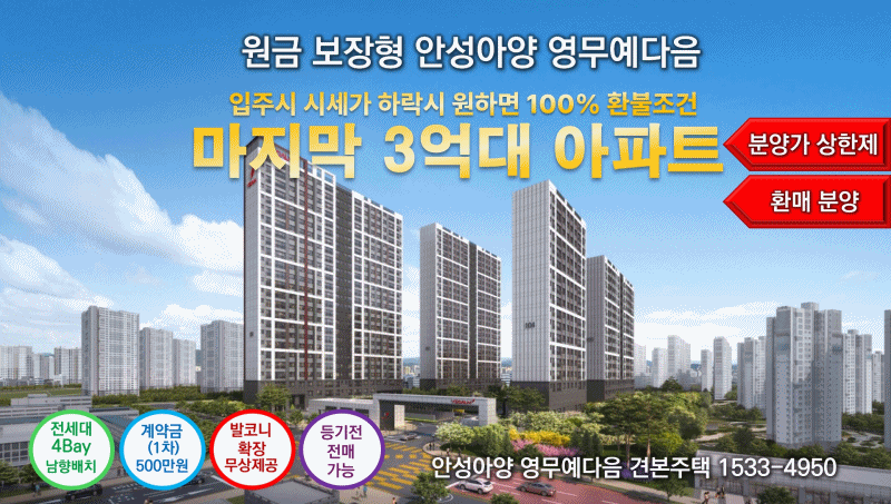 안성 아양 영무예다음 이 신도시급 중심생활권을 품은 블루칩 아파트로 떠오르고 있습니다. 대규모 개발호재와 함께 정부의 대출규제까지 피하는 마지막 수혜단지로 자리매김하면서, 실수요와 투자자들의 관심이 집중되는 분위기입니다.