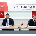 이스타항공-조종사노조, 단체협약 체결 이스타항공은 지난 7일 서울시 강서구 이스타항공 대회의실에서 이스타항공 조종사노동조합과 단체협약을 체결했다고 8일 밝혔습니다. 이날 체결식엔 최종구 대표이사 사장, 신영근 조종사노동조합 위원장 등이 참석했습니다. 회사와 노조는 안전운항과 동반성장을 위한 근로문화 구축 등을 골자로 하는 단체협약을 체결했습니다. 이스타항공은 "노조와 지난해부터 지속적인 협의를 통해 단체협약에 대한 합의안을 도출하고, 지난 1월 조합원의 찬반투표를 거쳐 최종협약안을 타결했다"며 "지난해 3차례 교섭으로 임금협약도 체결하는 등 상호신뢰를 바탕으로 상생의 기틀을 마련했다"고 설명했습니다. 최 사장은 "바쁜 스케줄에도 교섭으로 이어질 수 있도록 협조해 준 노동조합에 감사하다"며 "단체협약 타결..
