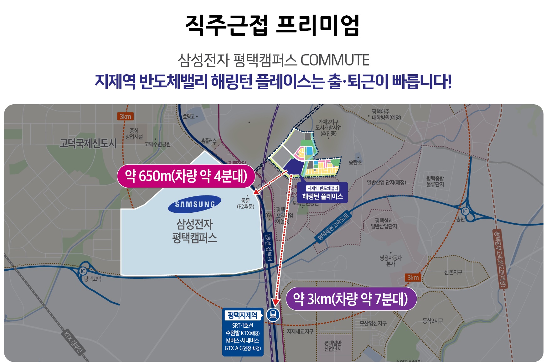 지제역 반도체밸리 해링턴 플레이스는 최근 발표된 GTX -A· C노선 지제역 연장 계획의 최대 수혜역으로, 서울 강남역까지 약 30분 내외로 연결될 예정입니다. 또한, 세계 최대규모 반도체 클러스터인 삼성전자 평택 캠퍼스와 인접하여 직주근접 배후수요가 풍부한 것으로 전망됩니다.