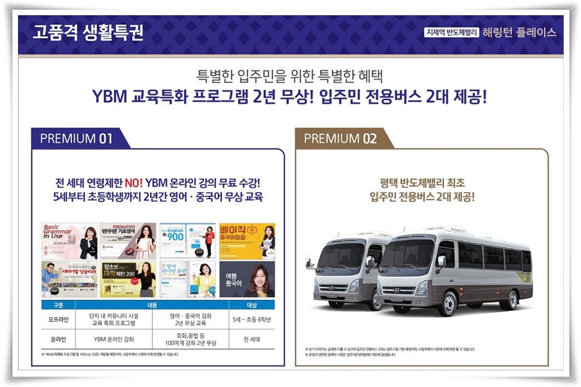 또한 YBM과의 제휴로 입주민 자녀들은 YBM 원어민 강좌 2년 무상, 영어/일어/중국어 등 100여개 온라인 강좌 2년 무료 혜택이 주어집니다.