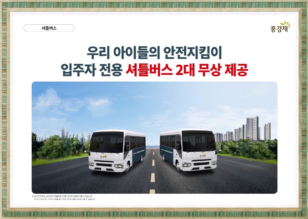 이 외에도 제주 중부공원 제일풍경채 센트럴파크는 아이들의 안전 통학을 위해 셔틀버스 2대를 무상으로 제공하는가 하면, 부피가 큰 생활용품이나 계절 용품을 보관할 수 있는 세대별 계절창고도 제공할 계획이다.
